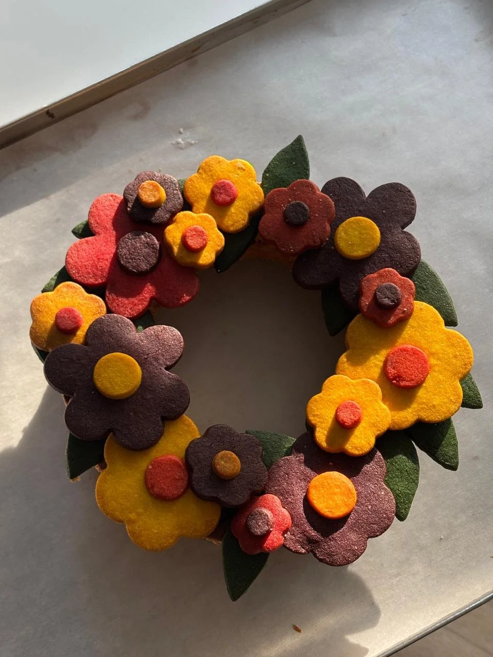 We’ve reimagined the traditional May Wreath as a piece of edible art. Built on a base of our 72H sourdough tsoureki with citrusy mandarin cream, the wreath is finished with artisanal buttery biscuits in bold flower shapes and colours.