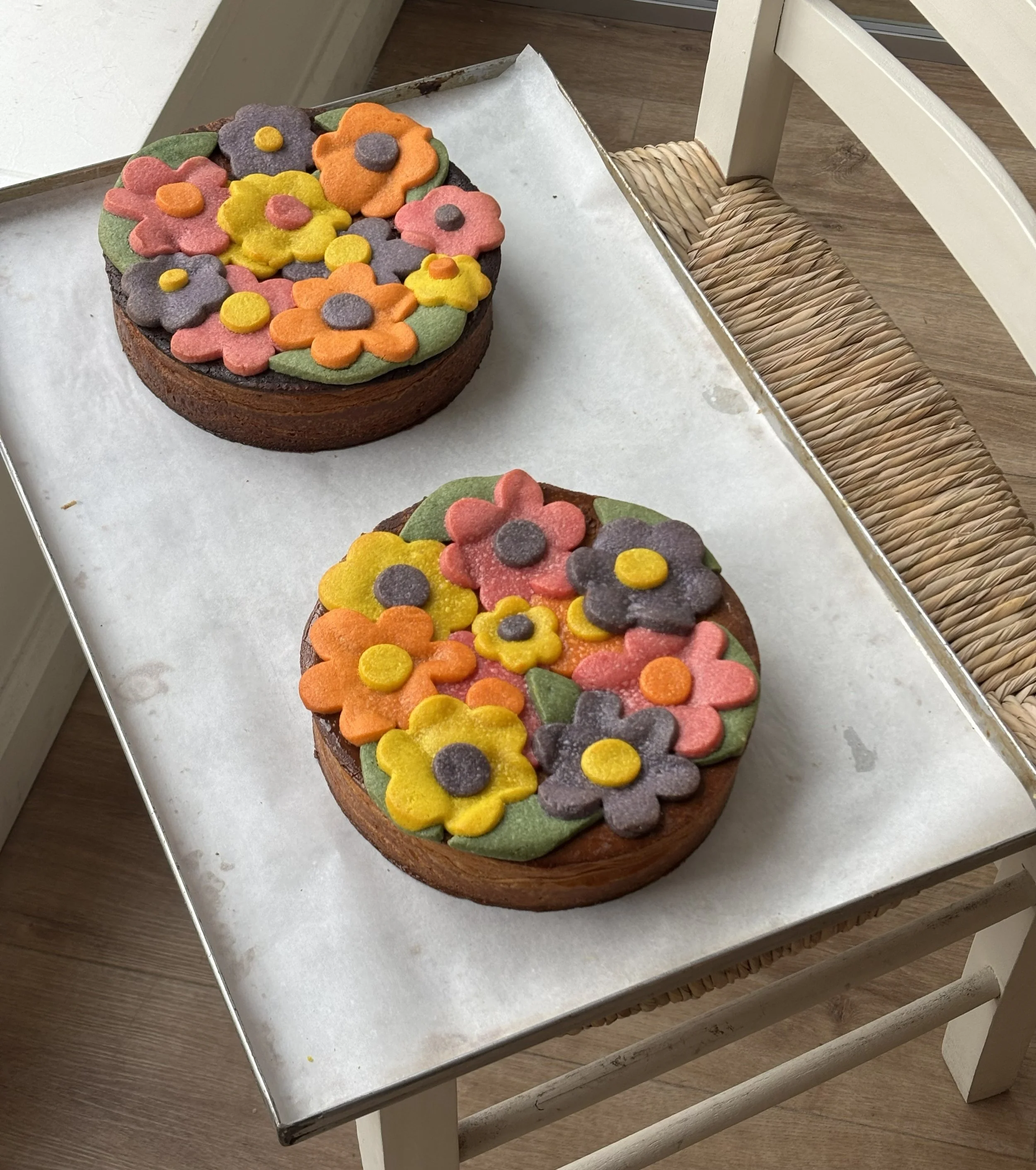 Στην επιφάνεια, μπισκοτένια λουλούδια σκεπάζουν ολόκληρο το γλυκό. Η εικόνα παραπέμπει στα ανοιξιάτικα λιβάδια, αλλά με έντονα χρώματα και καθαρά pop σχήματα. Οικείο, αλλά ανόμοιο με οτιδήποτε άλλο έχεις δει.